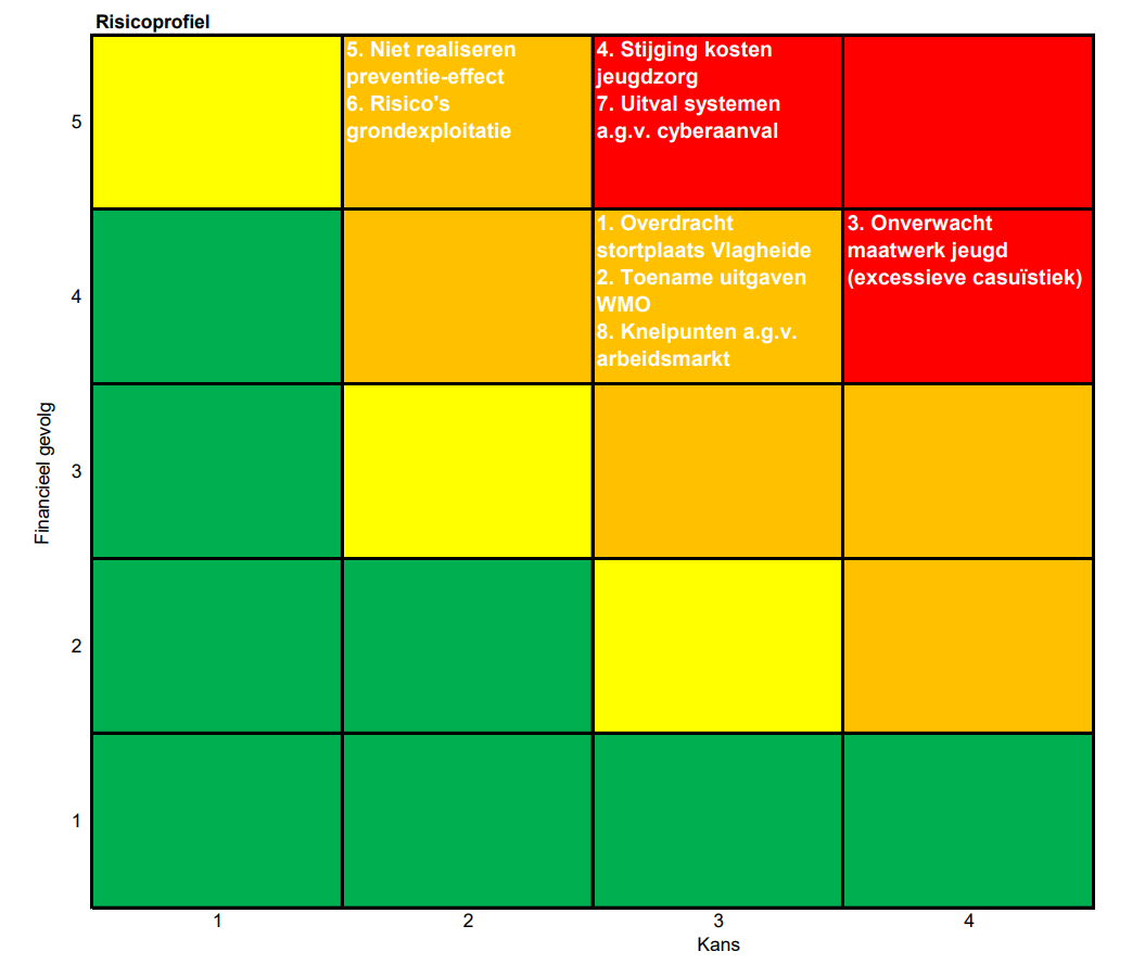 Risico’s worden vastgelegd in het risicoregister. Per risico is een inschatting gemaakt van de kans dat het risico zich voordoet en de financiële gevolgen ervan. Deze inschatting is in lijn met het beleid vertaald naar een risicoscore.