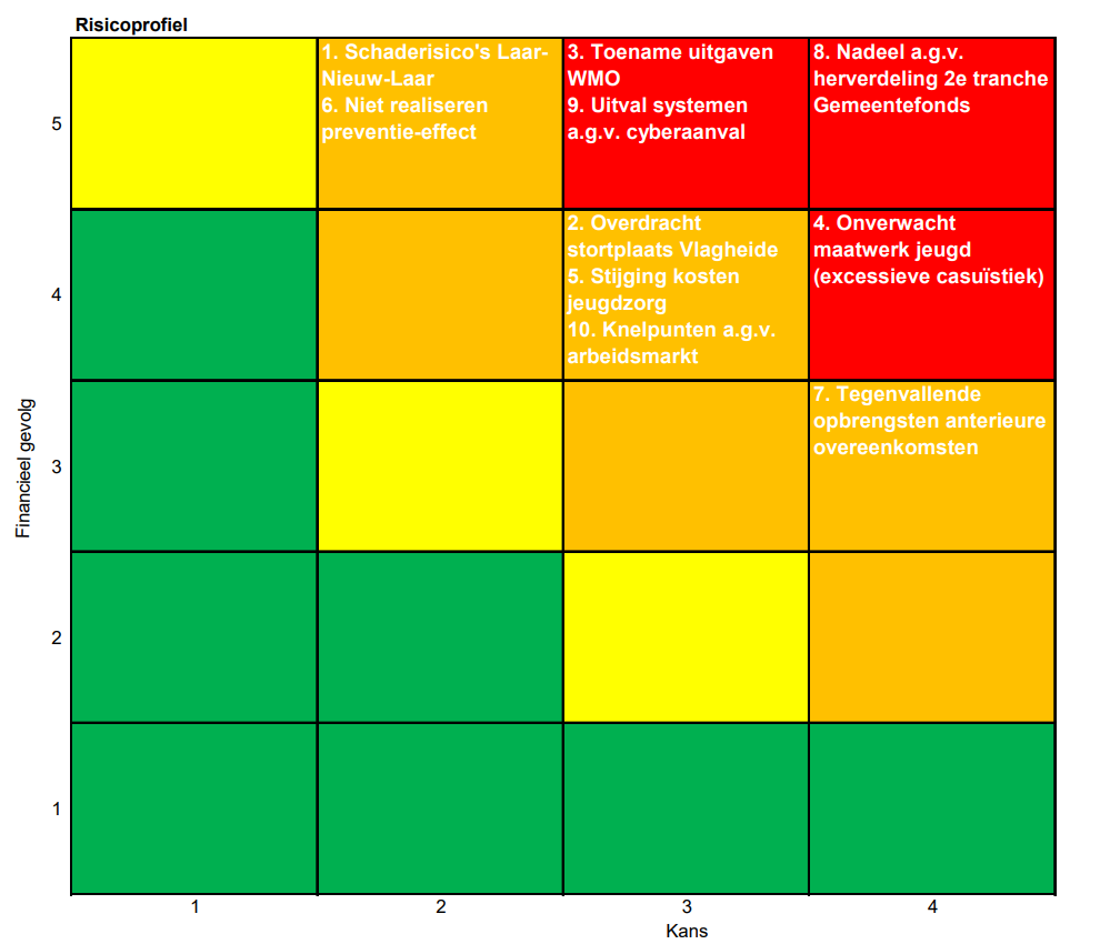 Risico’s worden vastgelegd in het risicoregister. Per risico is een inschatting gemaakt van de kans dat het risico zich voordoet en de financiële gevolgen ervan. Deze inschatting is in lijn met het beleid vertaald naar een risicoscore.