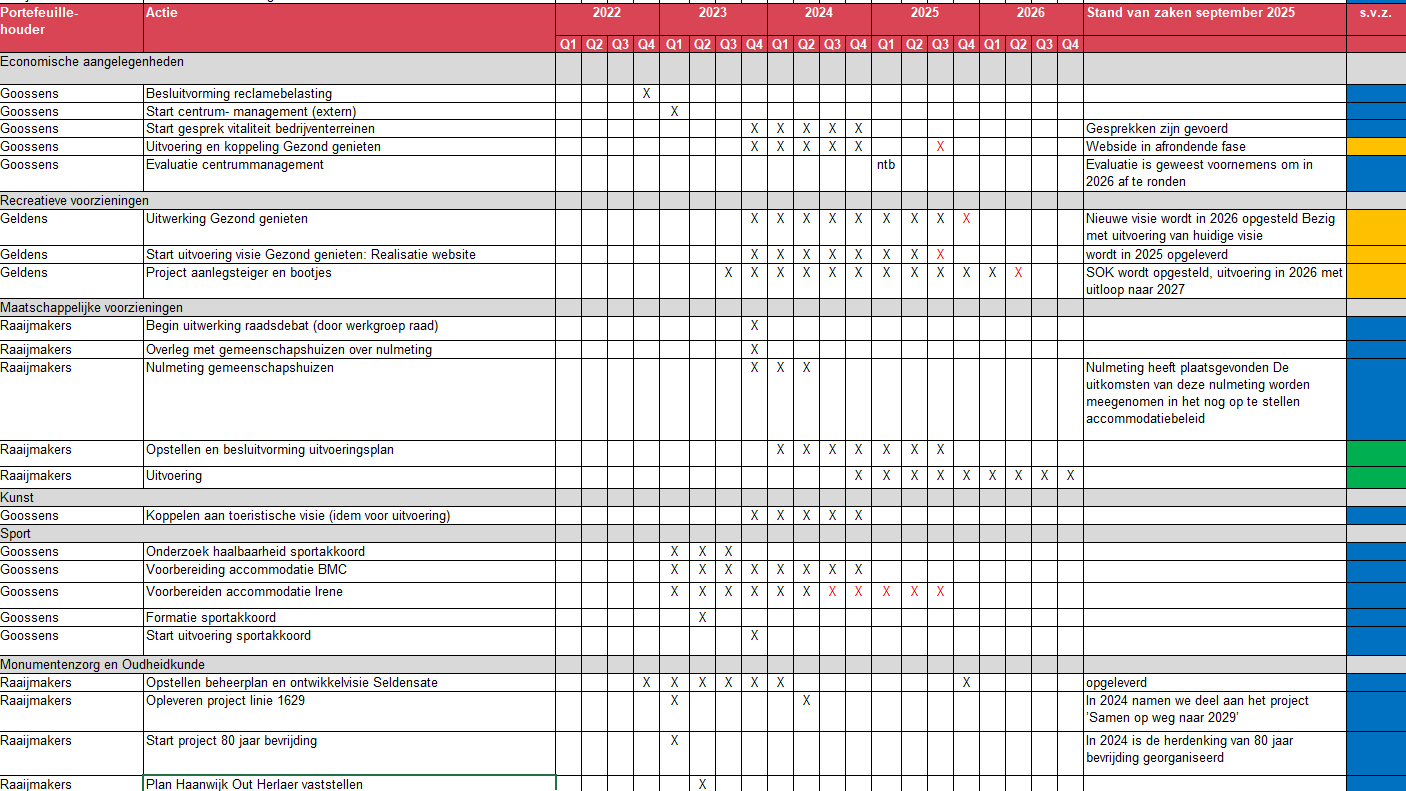 Hierna volgt een tabel waarin per activiteit uit het uitvoeringsprogramma staat wat de voortgang is. De activiteiten die op oranje of rood staan zijn verder toegelicht.